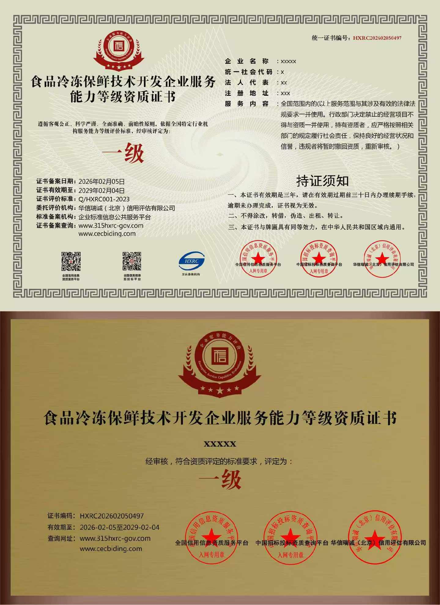 绿色健康食品企业;食品原材料供应链服务能力评价;生鲜食材配送服务企业;食品冷冻保险技术开发企业服务能力等级资质证书;